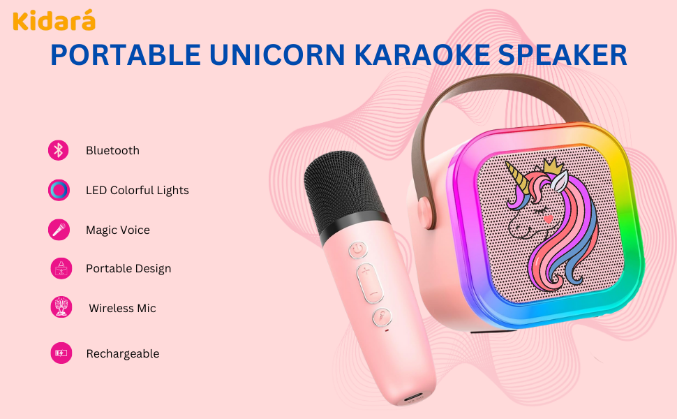 New Unicorn Themed Karaoke Speaker with Wireless Mic & LED Lights (Pink)